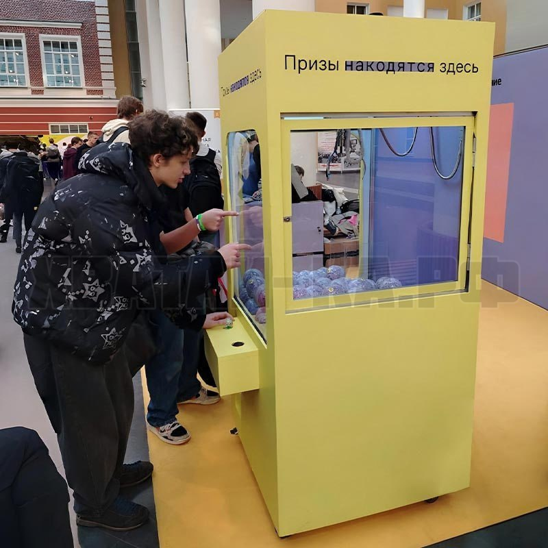 В аппарате установлена программа, которая генерирует выигрыш и в случайном порядке отпускает игрушку в нижней части, при подъёме, в самом верху.