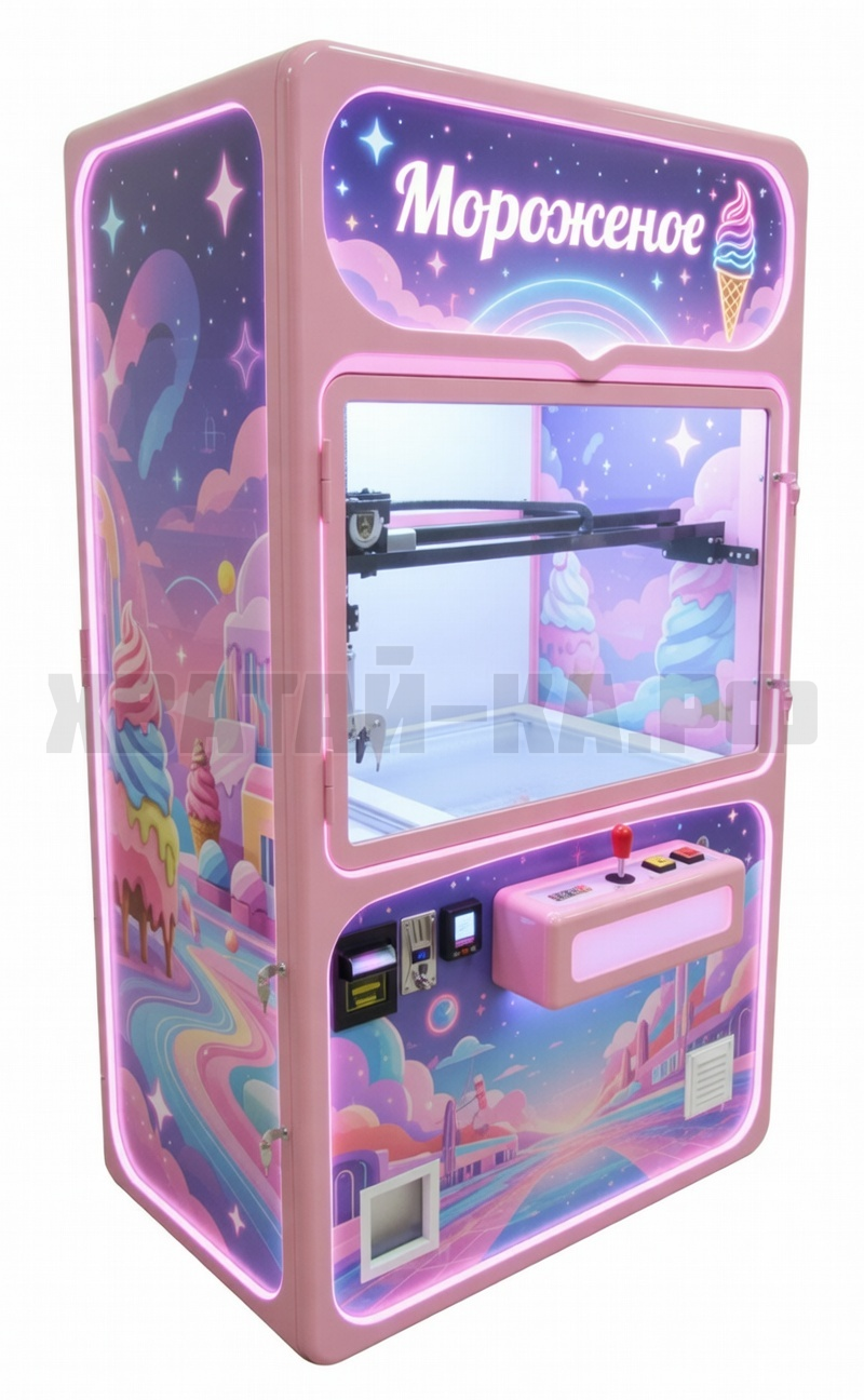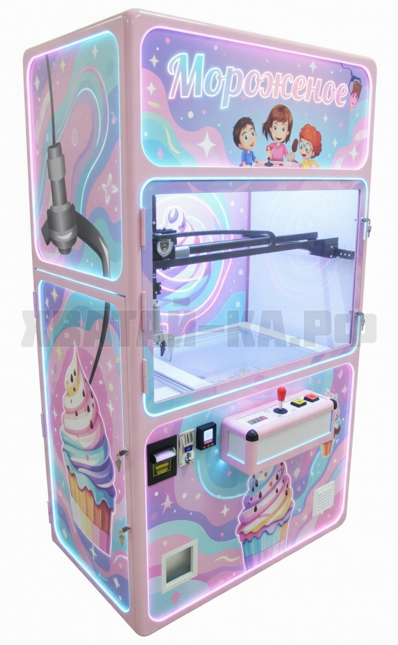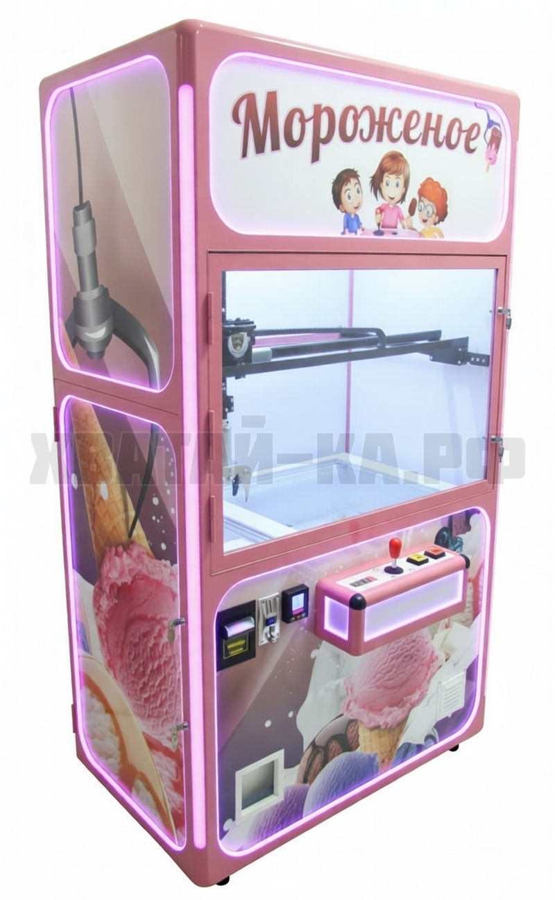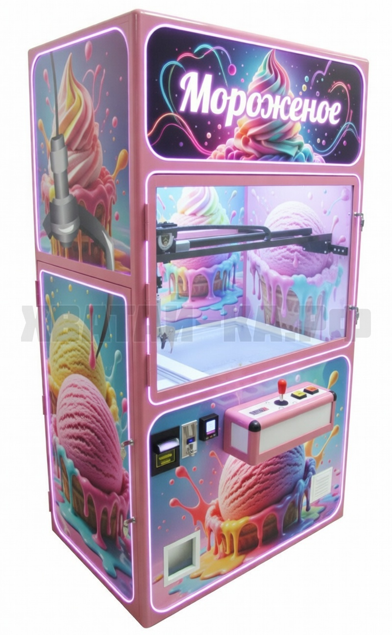 Управляя джойстиком и двумя кнопками опускание и захват, покупатель весело и легко подгоняет клешню на мороженное и хватает его. Если с первого раза не получилось схватить, то сразу можно пробовать еще раз. После захвата клешня сама отвозит мороженное в призовое в окно выдачи.